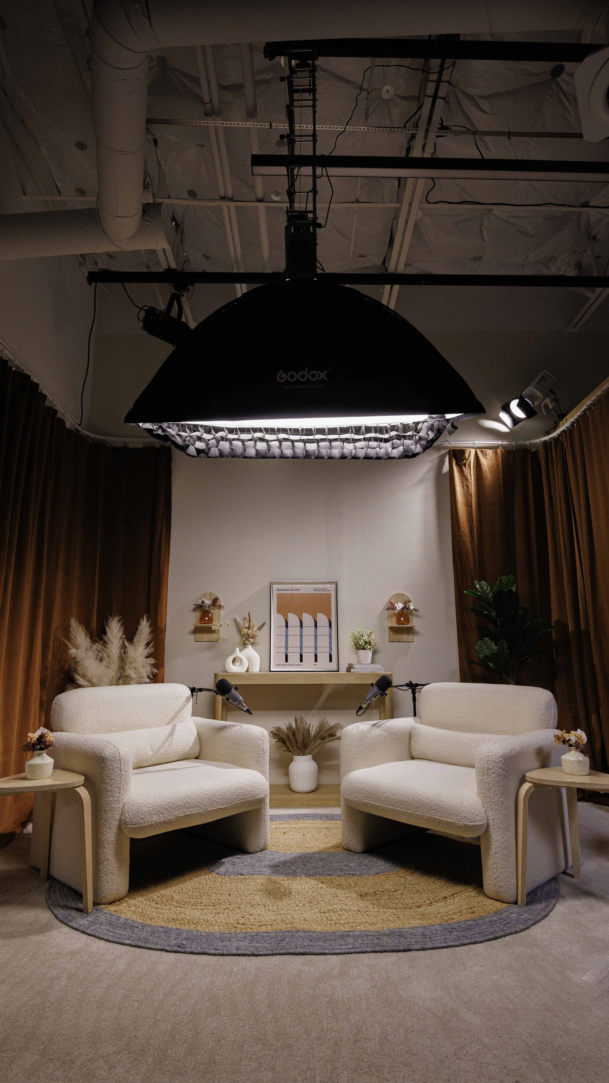 Our studio is equipped with 2x MXL pro level broadcast microphones per set. Please contact us if more microphones are needed for your rental